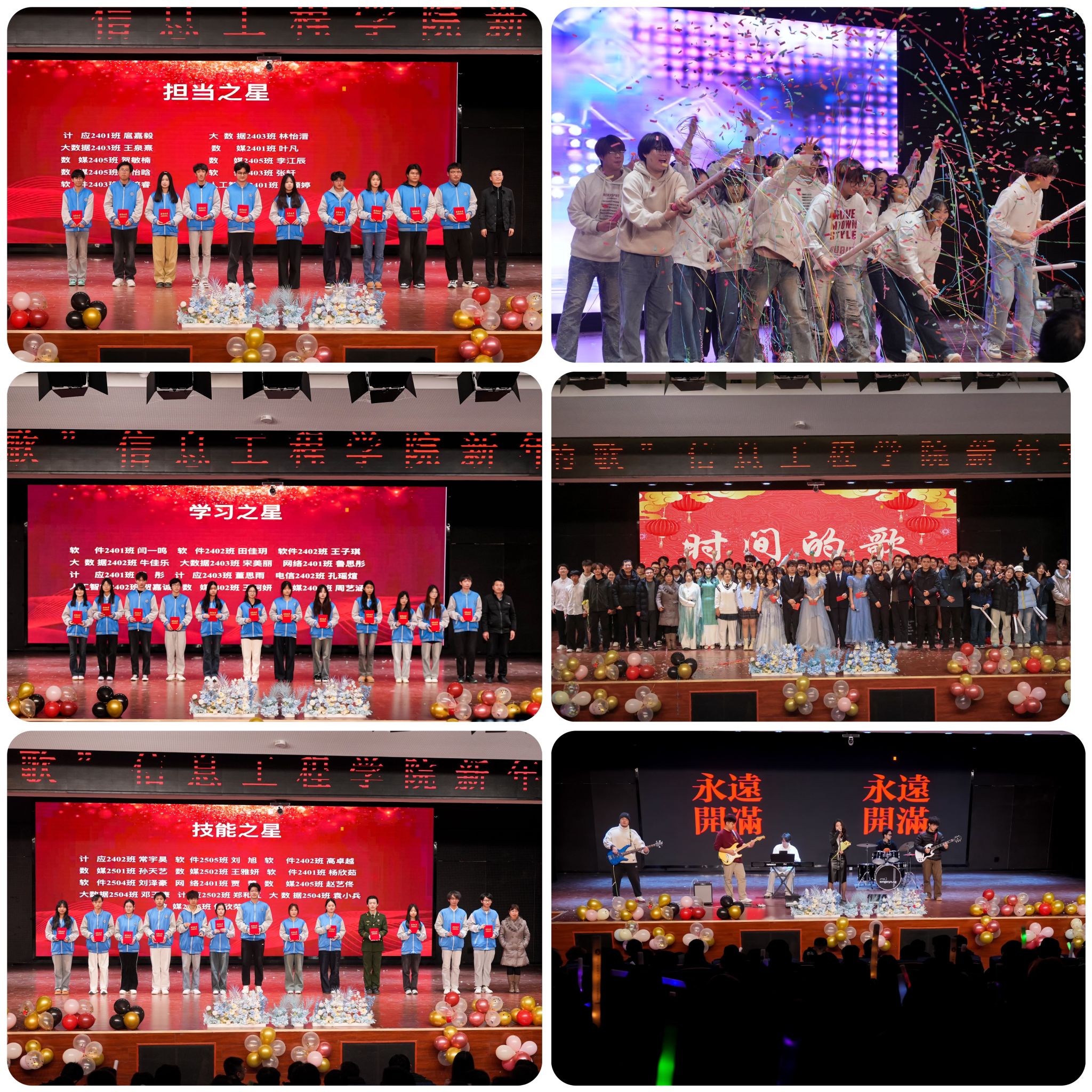 为展现学子青春风采,凝聚奋进力量,1月5日晚,信息工程学院“时间的歌”新年文艺晚天博b综合体育app官网在经开校区图文报告厅二隆重举行。信息工程学院党总支书记王伟、院长白国政、党总支副书记郭新玲、学工办主任赵松及全院师生代表300余人到场观看,同时通过线上视频直播吸引了超过2000名观众实时观看与互动。