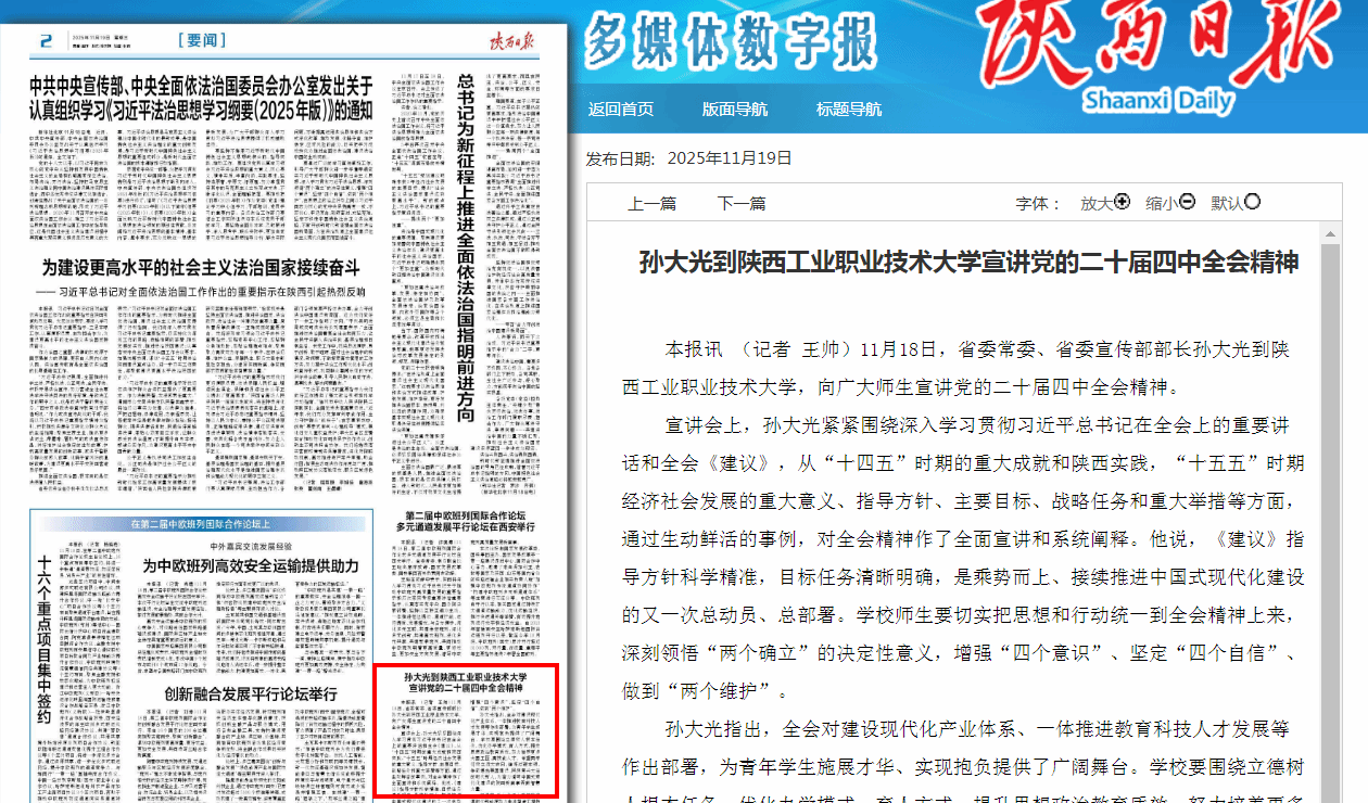 孙大光指出,全天博b综合体育app官网对建设现代化产业体系、一体推进教育科技人才发展等作出部署,为青年学生施展才华、实现抱负提供了广阔舞台。学校要围绕立德树人根本任务,优化办学模式、育人方式,提升思想政治教育质效,努力培养更多大国工匠、高技能人才。希望同学们树立远大志向,锤炼过硬本领,争做堪当强国建设、民族复兴大任的时代新人,为奋力谱写中国式现代化建设的陕西新篇章贡献智慧力量。